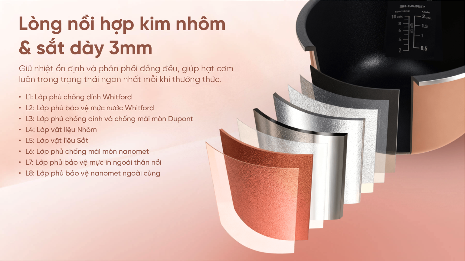 - Lòng nồi dày 3mm chống dính với 8 lớp phủ cao cấp.