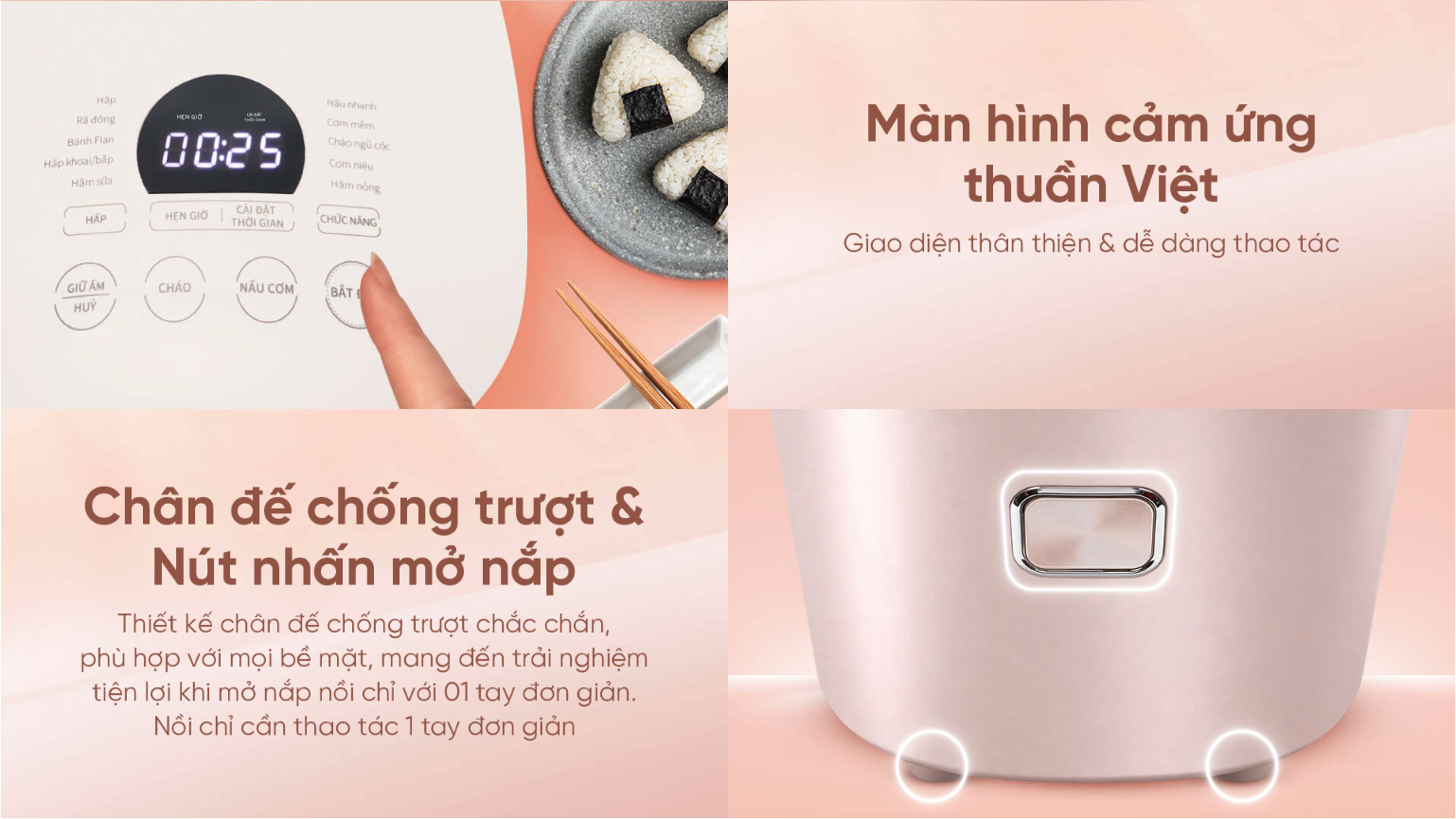 | Chức năng nấu | Nấu cơm; Cháo; Nấu nhanh; Cơm mềm; Cháo ngũ cốc; Cơm niêu; Hâm nóng; Hấp; Rã đông; Bánh; Flan; Hấp khoai/bắp; Hâm sữa |